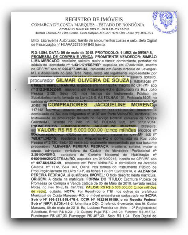 Gilmar Oliveira de Souza aparece em dois momentos centrais do caso. Em 2018, ele atuou como procurador na venda da Fazenda Seringal Rio Cautário, de 47 mil hectares, para sua esposa, Jacqueline Moreno, por R$ 5 milhões, conforme registrado em cartório. A transação contraria a Lei do Sistema Nacional de Unidades de Conservação (Snuc), que proíbe registros privados em reservas extrativistas, salvo se comprovada a posse anterior à criação da unidade – o que, segundo o Incra, não ocorreu.