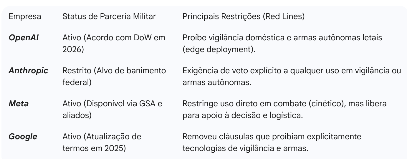 A tabela abaixo compara o posicionamento das principais empresas de IA em relação ao uso de suas ferramentas pelas forças armadas