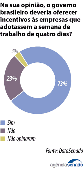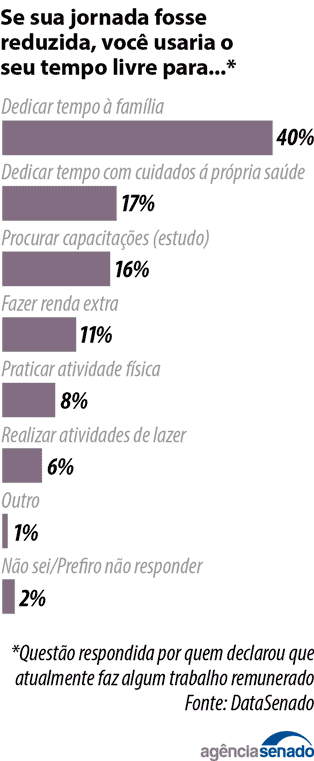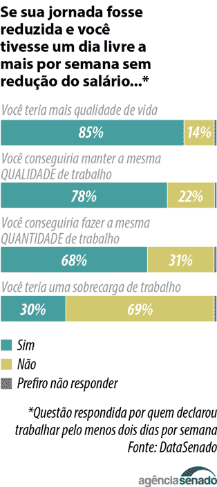 Para os defensores da ideia, a diminuição de carga horária, além de beneficiar os empregados, pode até trazer ganho de produtividade para os patrões. Pesquisa de opinião elaborada pelo Instituto DataSenado em abril deste ano, em conjunto com o gabinete da senadora Soraya Thronicke (Podemos-MS), reforça essa percepção. O estudo revelou que 85% dos trabalhadores brasileiros acreditam que teriam mais qualidade de vida, caso tivessem um dia livre a mais por semana, sem corte no salário; e 78% afirmam que conseguiriam manter a mesma qualidade de trabalho. O tempo livre seria dedicado principalmente à família, ao cuidado com a própria saúde e à capacitação, disseram os trabalhadores ouvidos.
