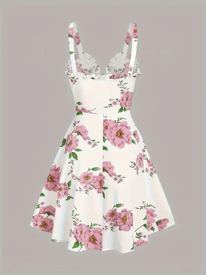 Vestido de tanque com babados estampado floral, Vestido elegante com botões na frente e detalhes franzidos para a primavera e verão, Roupas femininas - R$95,08 (apenas para novos usuários)