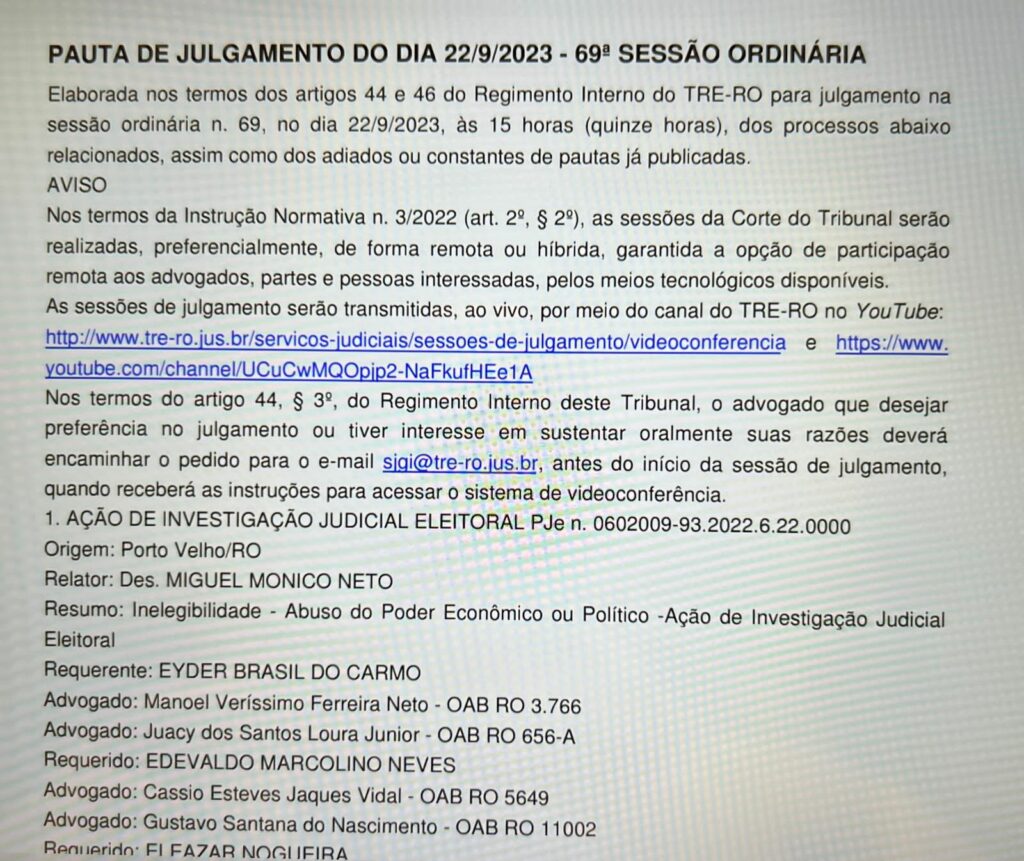 A pauta foi publicada esta semana e uma Ação de Investigação Judicial Eleitoral (AIJE) PJe n. 0602009-93.2022.6.22.0000, movida pelo ex-deputado estadual Eyder Brasil por Abuso do Poder Econômico ou Político contra o deputado estadual eleito Edevaldo Neves (Patriota), que tem como relator o desembargador Miguel Monico será o primeiro julgamento.