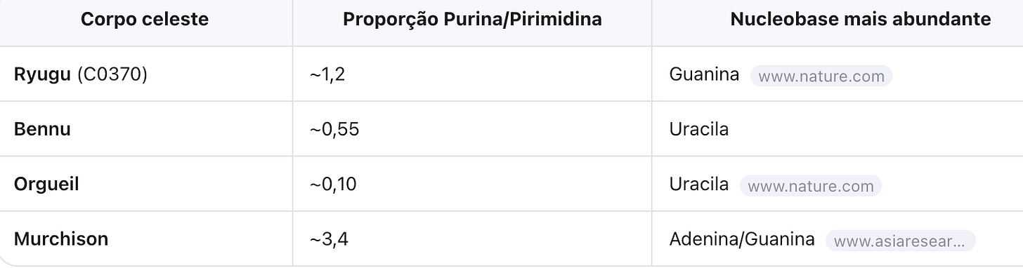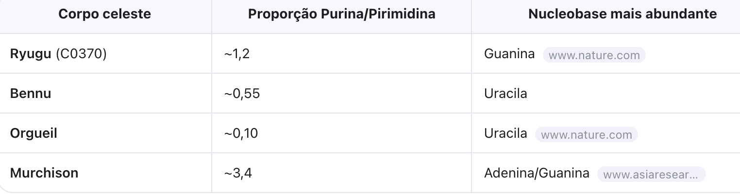 • Diferenças nas proporções de purinas e pirimidinas entre Ryugu, Bennu e meteoritos sugerem caminhos químicos distintos em cada corpo celeste