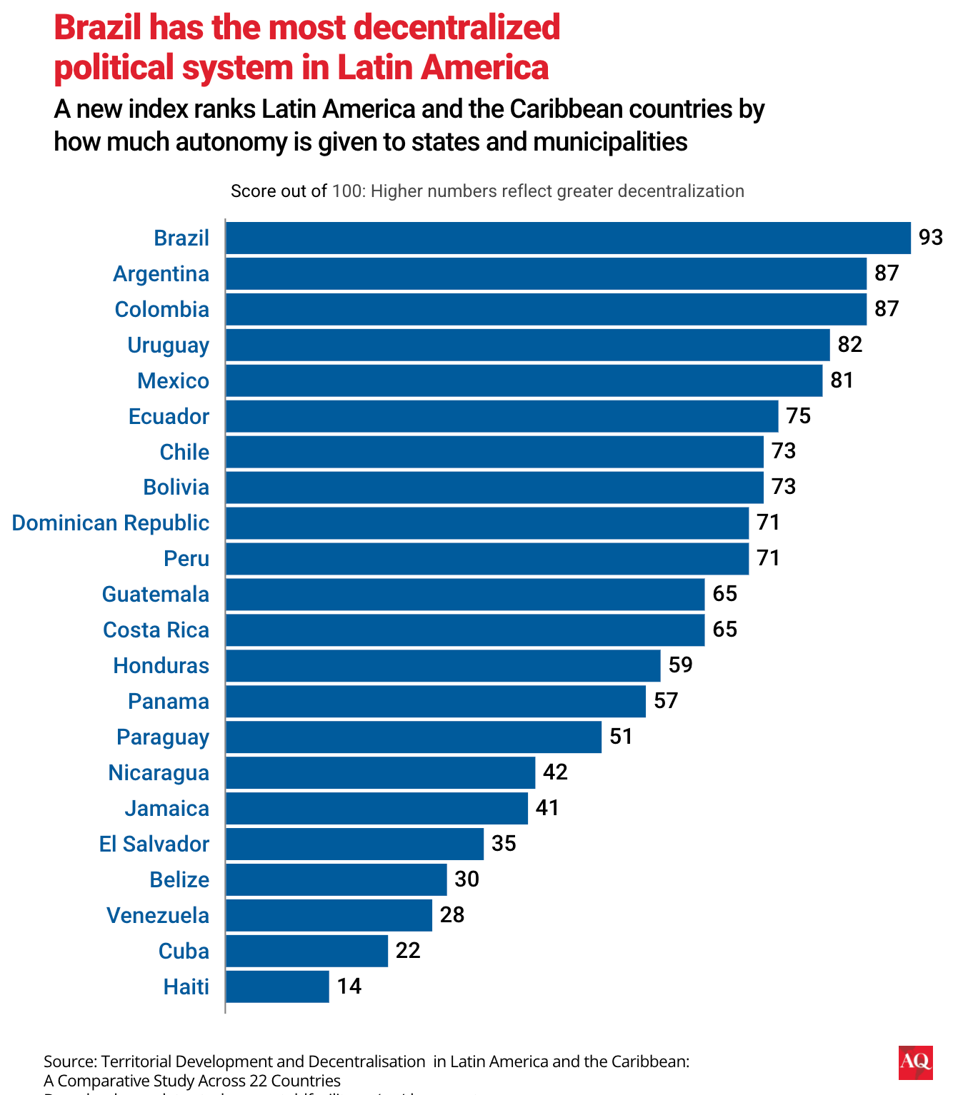 Desde a década de 1970, países como Bolívia, Colômbia, Peru, República Dominicana, Equador e, mais recentemente, Chile, reescreveram constituições, ampliaram eleições locais e atualizaram marcos legais para transferir poder aos governos subnacionais. Hoje, governadores são eleitos em 12 países da região, contra apenas um em 1980. No papel, a autonomia municipal é reconhecida constitucionalmente em quase toda a América Latina.