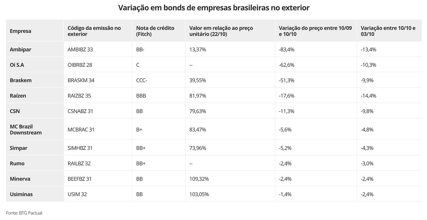Bonds são, em essência, instrumentos de dívida emitidos por empresas estrangeiras ou no exterior, denominados em dólar, com remuneração prefixada e, em alguns casos, cupom variável. No Brasil, muitas companhias que têm emissões externas nessa modalidade viram seus papéis sofrerem forte desvalorização diante de uma combinação de fatores de risco: liquidez, câmbio, spread de crédito mais elevado e retirada de capital externo.