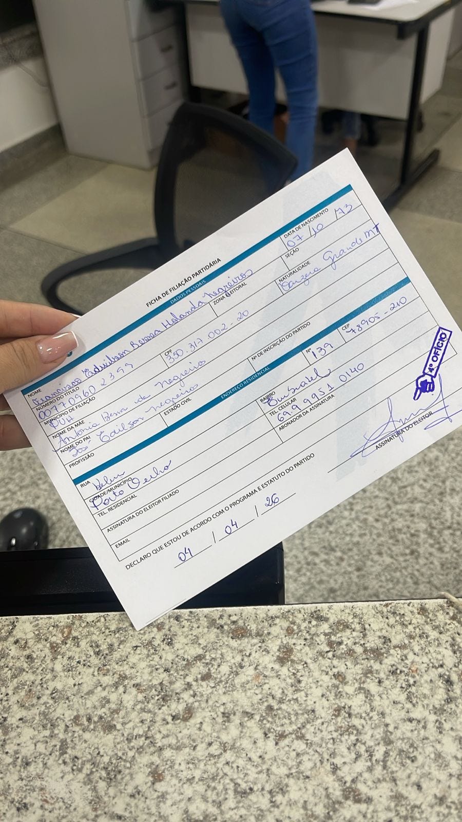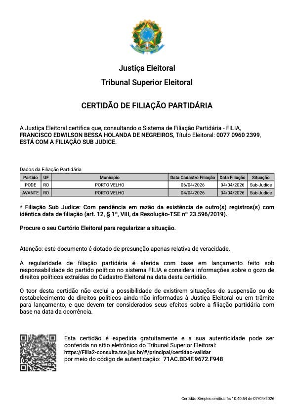 O pré-candidato a deputado estadual por Rondônia Edwilson Negreiros é alvo de apuração por suposta fraude em filiação partidária. Segundo informações apuradas pelo Painel Político, ele assinou ficha no Avante em 4 de abril — prazo final da janela partidária — e, dois dias depois, registrou nova filiação no Podemos com data retroativa. O Avante afirma possuir o documento original (mais abaixo) reconhecido em cartório e deve acionar o corpo jurídico. O caso pode chegar ao Tribunal Regional Eleitoral de Rondônia (TRE-RO) e, se confirmada a irregularidade, resultar na impugnação do registro de candidatura.