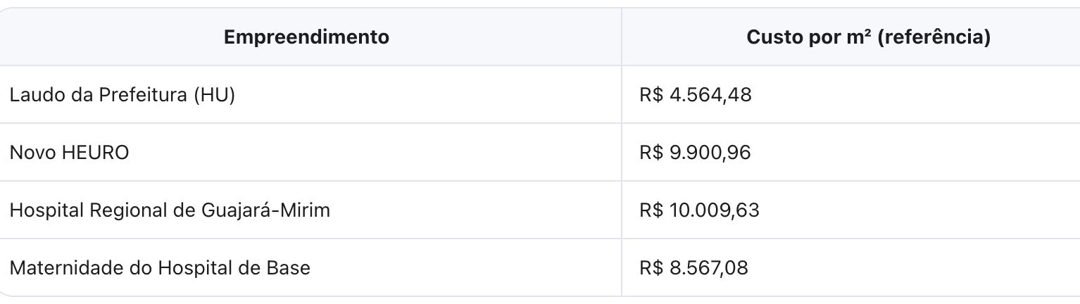 Para ilustrar a fragilidade da abordagem municipal, o TCE-RO comparou os custos por metro quadrado com outras obras hospitalares no estado: