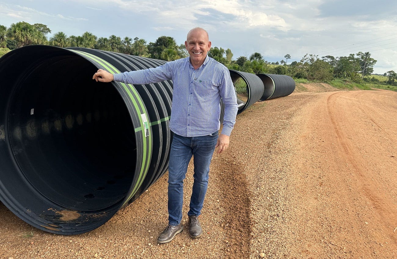Recentemente, Ezequiel Neiva esteve presente na Linha 21, onde acompanhou de perto a chegada e a instalação dos tubos, trabalho executado pela Prefeitura de Nova Mamoré. “Estive na região para fazer uma vistoria dos tubos em Pead que vão substituir uma ponte de madeira aqui próximo. São tubos com 1,5 metro de diâmetro, que trarão mais segurança para todos que trafegam por aqui — seja de bicicleta, moto, carro ou caminhão”, destacou o deputado.