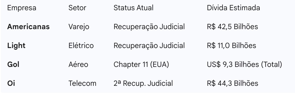 ✅ Outros Setores em Risco: A crise é transversal. Empresas como a Light (setor elétrico), Gol (setor aéreo - Chapter 11 nos EUA) e Americanas (varejo) também se encontram em processos complexos de recuperação judicial ou reestruturação.