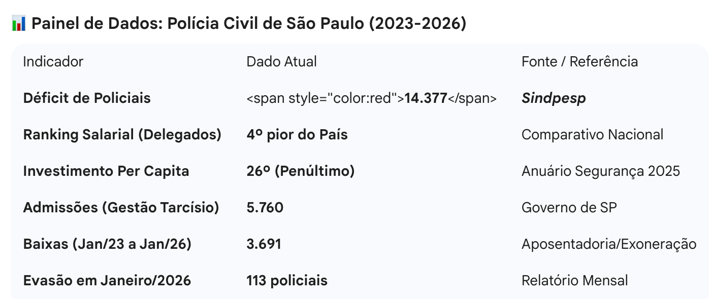 Palavras-chave (SEO): Segurança Pública SP, Polícia Civil SP, Tarcísio de Freitas, Sindpesp, Jacqueline Valadares, déficit policial, valorização salarial, política de São Paulo.