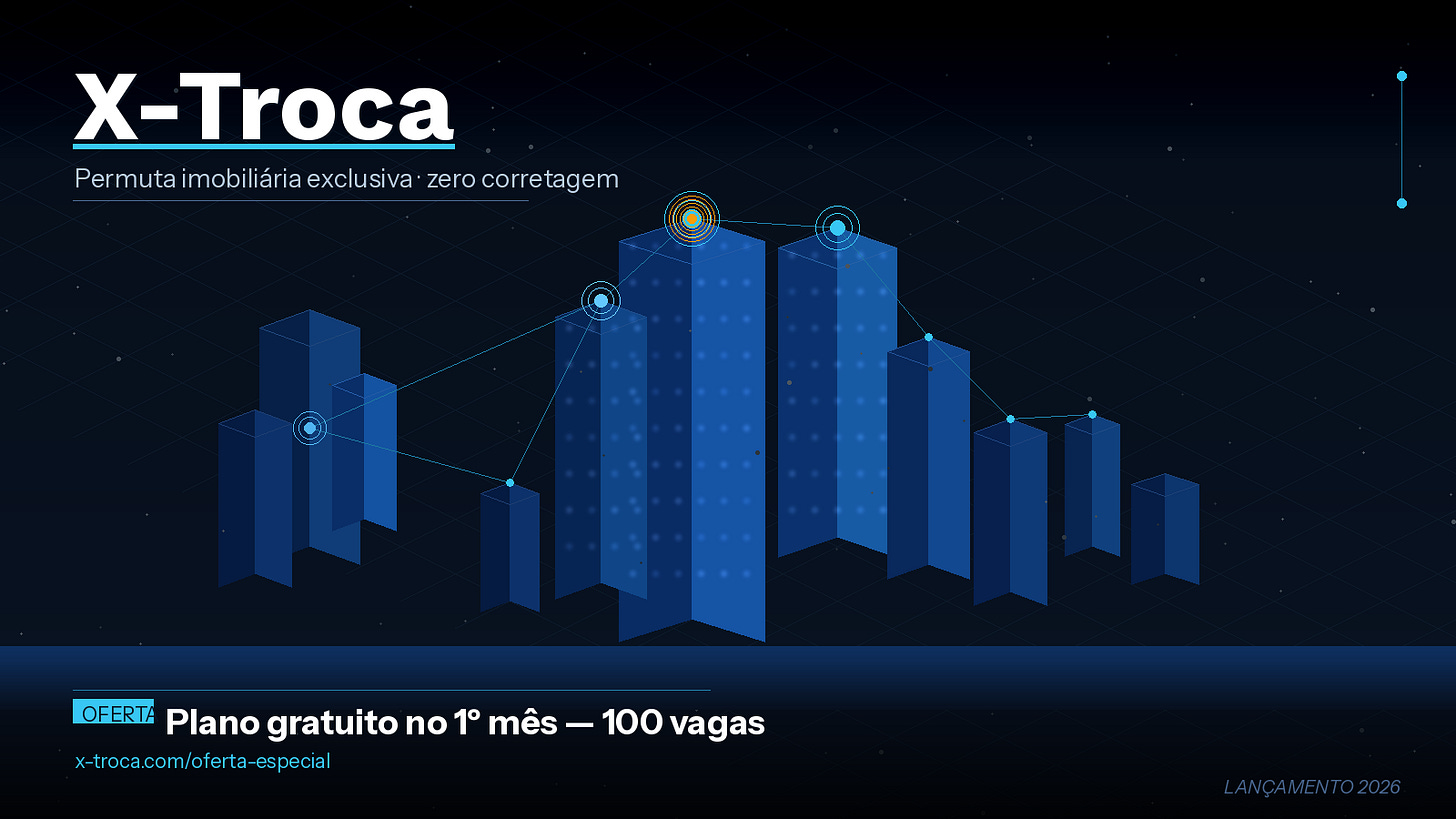 A X-Troca (x-troca.com), plataforma digital lançada em 2026, se posiciona como infraestrutura tecnológica exclusivamente dedicada à permuta imobiliária — a modalidade em que dois proprietários trocam seus imóveis entre si, com ou sem complemento em dinheiro (”troco”). O diferencial declarado pela plataforma é direto: zero cobrança de corretagem. A receita vem exclusivamente da contratação de planos mensais de uso, que começam em R$ 19,90 para pessoa física.