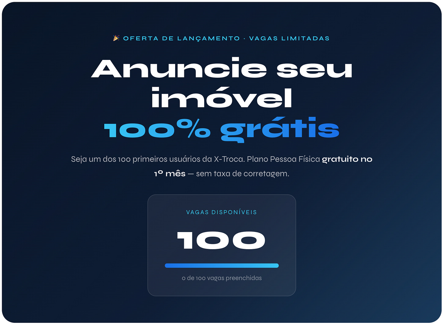 Para marcar o lançamento, a X-Troca disponibilizou uma oferta limitada a 100 usuários: o primeiro mês do plano Pessoa Física completamente gratuito, via cupom de desconto XTROCA100, com 100% de desconto aplicado automaticamente no checkout.